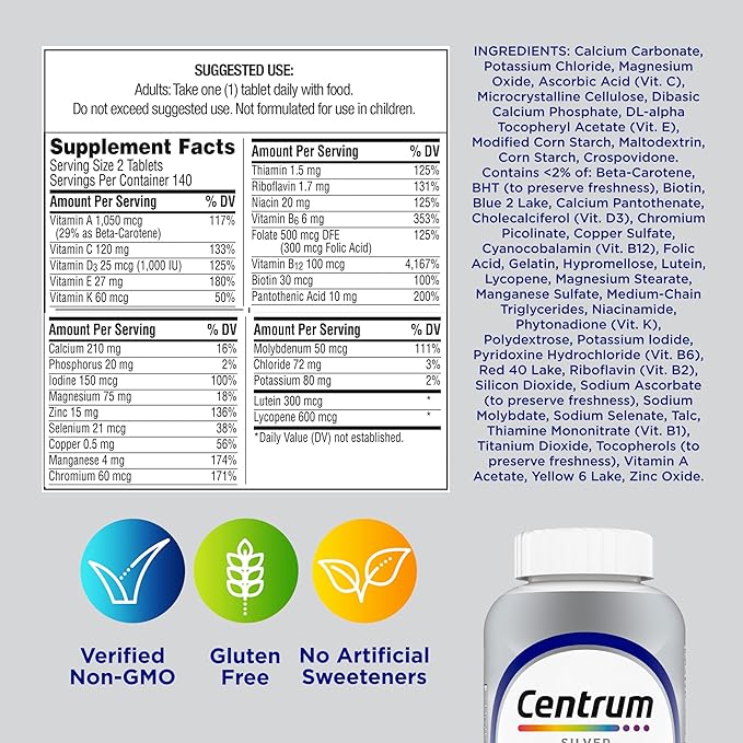 - One 200 count bottle of Centrum Silver Multivitamin for Men 50 Plus, Multivitamin/Multimineral Supplement with Vitamin D3, B-Vitamins and Zinc